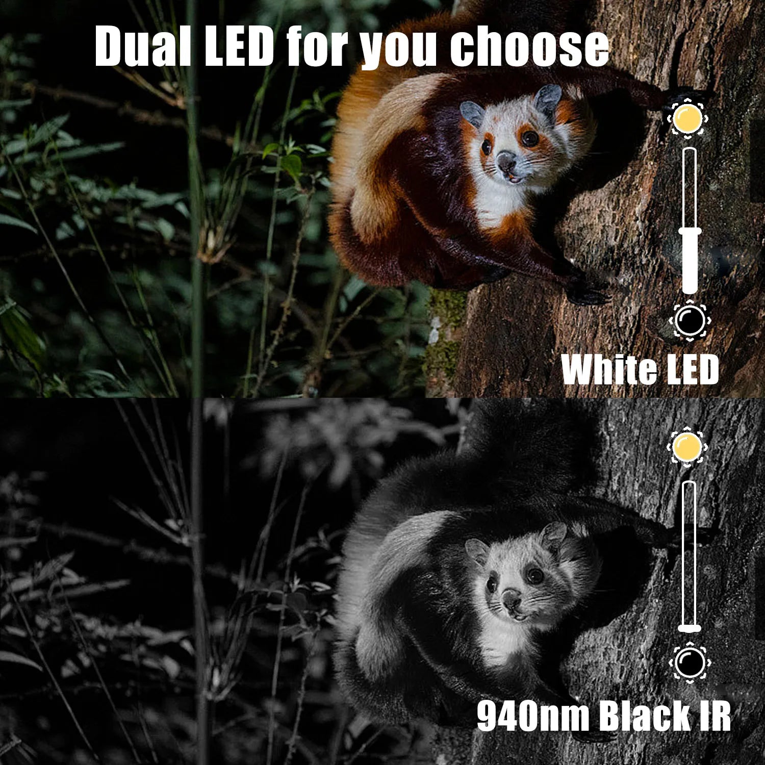 Choose between 940nm invisible IR LEDs for stealth night shots or White LED flash for full-color nighttime images. Perfect for discreet wildlife observation or detailed property monitoring.
