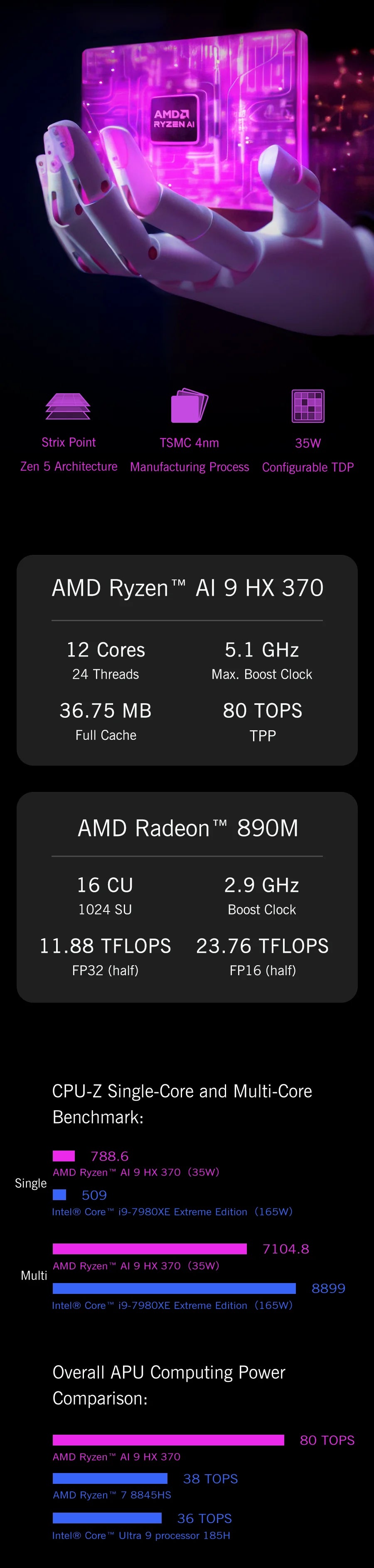 • Blazing-Fast AMD Processors: Powered by the latest AMD Ryzen AI9 HX370 or AMD 8840U CPU, with 8 cores, 16 threads, and up to 5.1GHz turbo frequency, ensuring smooth performance across gaming, business, and creative applications.