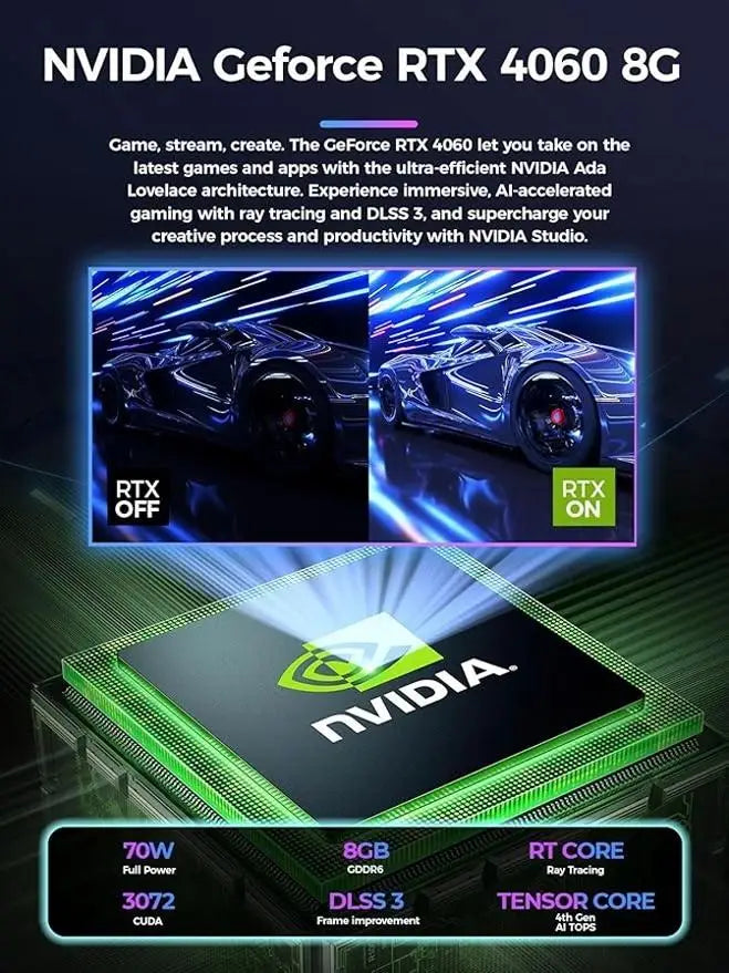 Experience high-performance computing in a compact design with the Desktop AI Office & Gaming Mini Computer. Equipped with the Intel Core i9-13900HX processor and NVIDIA RTX4070 8GB graphics, this mini PC delivers smooth gaming, seamless multitasking, and powerful AI performance.