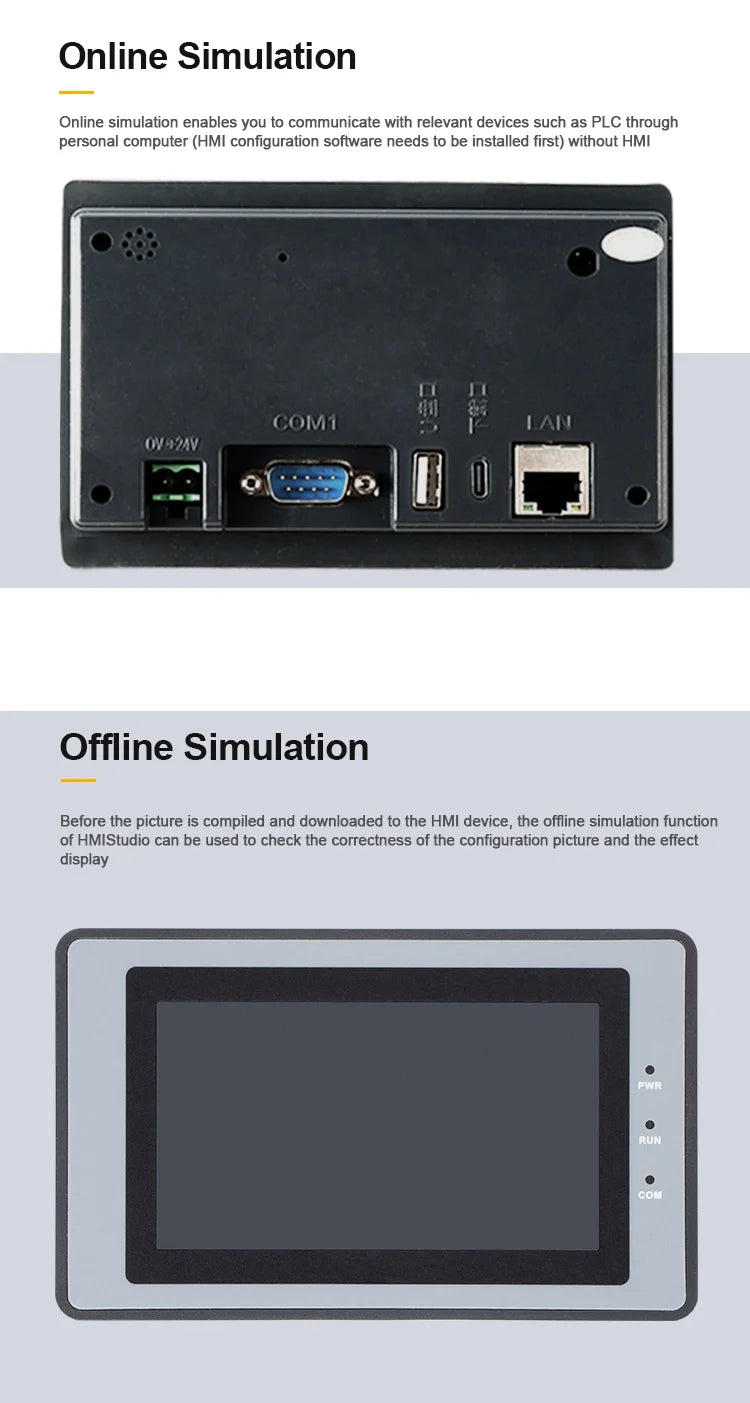 Upgrade your industrial control setup with the Huaqingjun 4.3 Inch LCD Touch Screen HMI. Featuring a clear 480x272 TN TFT display and a responsive 4-wire resistive touch screen, this HMI supports Ethernet, RS485, RS232, and RS422 communication, making it compatible with a wide range of PLC systems. With 128MB SPI NAND Flash memory, 2GB RAM, and a built-in real-time clock, it offers reliable performance for industrial monitoring and control. The device supports backlight adjustment, program downloads via USB, U disk, or Ethernet, and operates on DC19-30V power. Compact and durable, this HMI is perfect for efficient industrial applications.