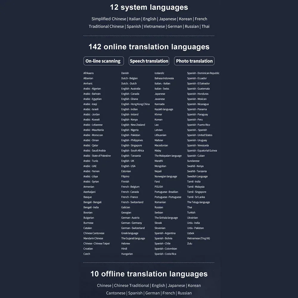 Supports 142 languages for online scanning, voice, and photo translation